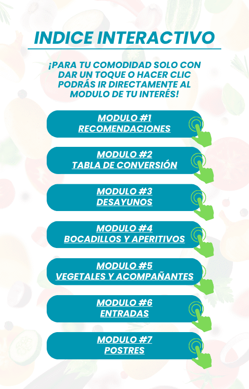 Con nuestro exclusivo Ebook aprenderás más de 150 deliciosas y saludables recetas entre desayunos, bocadillos y aperitivos, vegetales y acompañantes, carnes, pollos, pescados, postres, sopas, ensaladas y jugos.