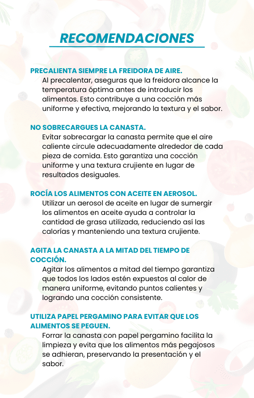 También aprenderás todas las recomendaciones necesarias para el buen uso de tu freidora de aire.